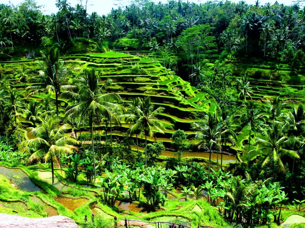 مزارع پلکانی برنج در منطقه اوبود در مزارع Tegallalang صحنه های بی نظیری را خلق کرده و به یکی از زیبایی های این منطقه تبدیل شده است. در این مزارع و سفر به این منطقه در صورتی که شانس با شما یار باشد، با نحوه ی سنتی و خاص کاشت برنج آشنا می شوید که مخصوص این منطقه می باشد. بهترین منطقه برای دیدن این مزارع زیبا، دهکده های Pejeng و Campuhan هستند.