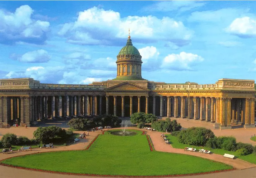 کلیسای جامع کازان بین یکی از بزرگترین کلیساهای سن پترزبورگ است که سال‌های ۱۸۰۱ تا ۱۸۱۱ میلادی ساخته شد و معمار آن، آندری وارانیخین، معمار توانمند روس بود. این کلیسا به شکرانه‌ی پیروزی بر ناپلئون ساخته شد چون مردم اعتقاد داشتند که با کمک مریم مقدس به این پیروزی رسیدند. داخل کلیسا تصویری از حضرت مریم وجود دارد که مسیحیان در مقابل آن، با احترام ایستاده و دعا و نیایش می‌کنند. ساختمان این کلیسا به شکل نیم دایره است و معماری روسی در هر گوشه‌ی آن استفاده شده تا یادآور تمدن این کشور باشد