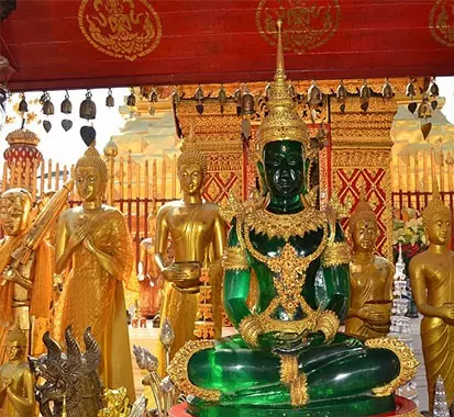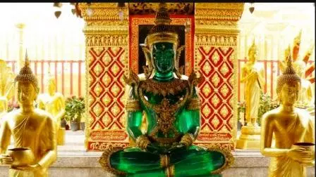 بودای زمردین مقدس ترین مجسمه بودا در کشور تایلند است و معبد آن در محوطه کاخ پادشاهی در شهر بانکوک واقع شده است. این بودای نشسته که از یشم سبز ساخته و با لباسی زرین پوشیده شده، ۴۵ سانت بلندی دارد. بودای زمردین از تاریخچه ای طولانی برخوردار است. بر اساس افسانه ها، این بودا سال ۴۳ قبل از میلاد در هند ساخته شده و پس از ۳۰۰ سال برای در امان ماندن ازجنگ داخلی به سریلانکا برده شد. پس از آن شاه برمه، فرستاده ای را برای بازگرداندن آن به سیلان فرستاد اما کشتی حامل آن گرفتار توفان شد و درکامبوج لنگر انداخت. در سال های بعد پس از گذر از لائوس، به ایالت چیانگ رای در شمال تایلند رسید.