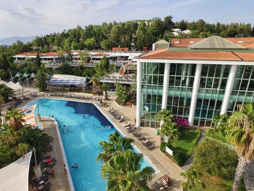 اتاق های این هتل پنج ستاره همگی به سیستم تهویه هوا تجهیز و با گل های کاغذی زیبا و رنگ های گرم تزئین شده اند. هر اتاق بالکن خصوصی و تلویزیون دارد. مهمانان می توانند از انواع غذاهای محلی و بین المللی طبخ شده در این هتل میل نمایند. وعده های غذایی به سفارش شما می تواند بر روی تراسی که منظره ای از دریای اژه دارد سرو گردد. عصرها نیز یک تیم انیمیشن برنامه های مفرح و زنده در خلیج پین برگزار می کنند.