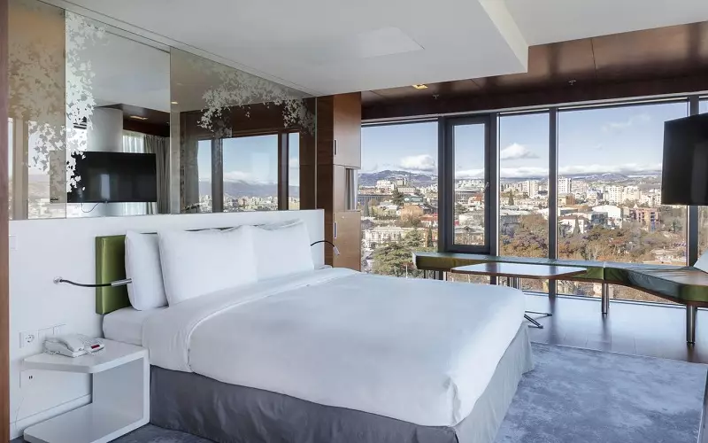 از پنجره برخی از اتاق های مدرن Radisson Blu Iveria Hotel می توان به تماشای تصاویر خیره کننده ای از شهر یا تپه تاریخی تفلیس و یا حتی رودخانه آن نشست. این منظره ها حتی از روی خوشخواب های اتاق نیز قابل دید هستند. کف اتاق های هتل رادیسون بلو ایوریا فرش شده اند و در این اتاق ها علاوه بر این که شهر را زیر پایتان حس می کنید، از امکاناتی مثل میز، تلویزیون صفحه تخت، چای ساز، مینی بار، حمام اختصاصی و تهویه مطبوع برخوردار خواهید بود. در حمام های تمامی واحدها لوازم استحمام رایگان و سشوار نیز در اختیار مهمانان قرار می گیرد.